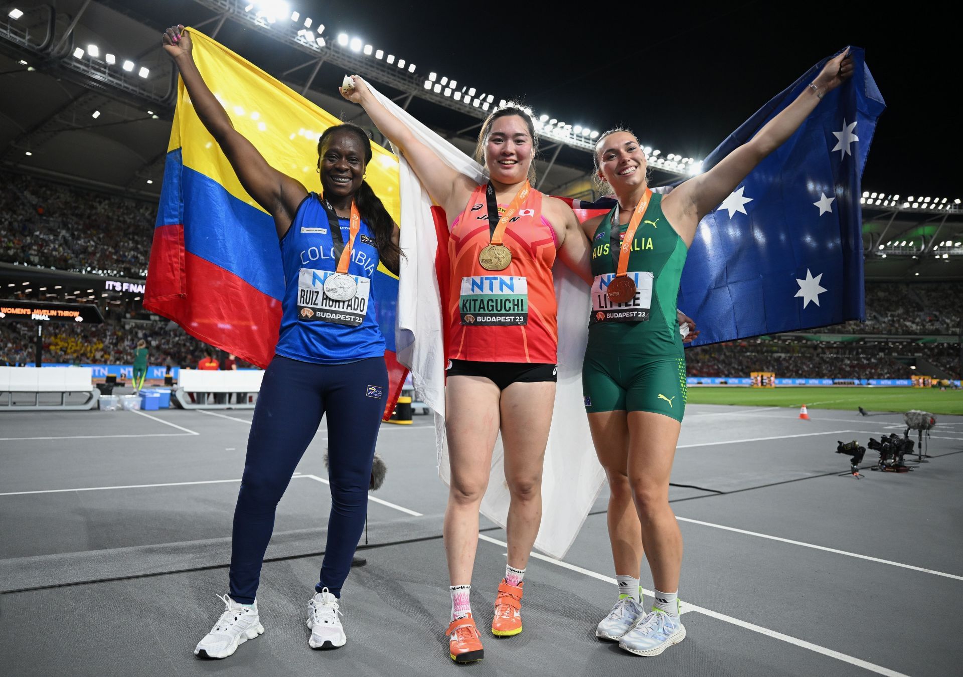 Japan's Haruka Kitaguchi won the world title in the women's Javelin throw with 66.73m. Flor Denis Ruiz Hurtado finished second on the podium with a throw of 65.47m. Australia's Mackenzie Little finished behind Hurtado with a throw of 63.38m.