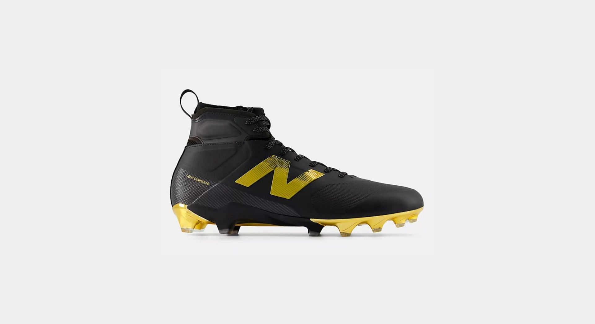 New Balance describes the Fortress model as football cleats, designed to provide midfoot stability and multi-directional traction. The upper is attired in a black synthetic material, accented by the metallic gold color on the side, and studs.