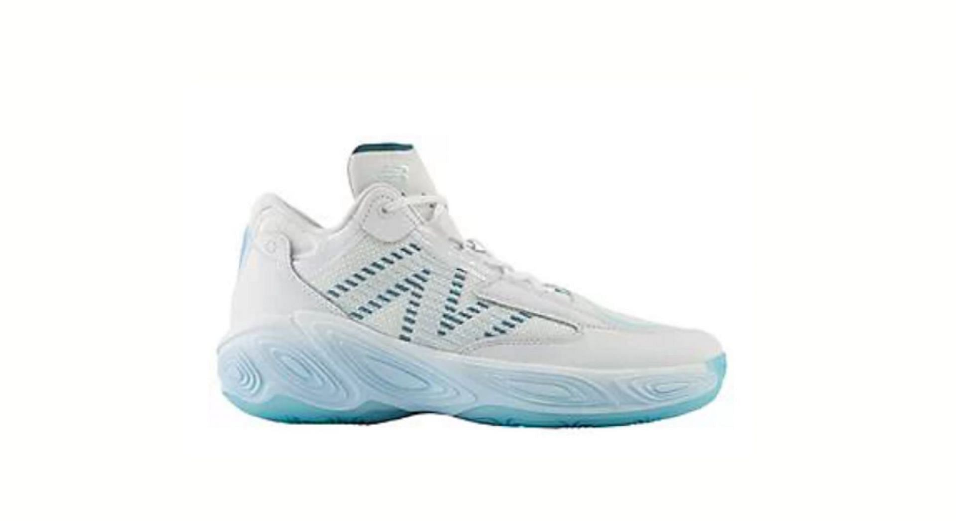 The New Balance Fresh foam BB v2 'Icy' sneakers feature TPU plates inserted into their midsoles for shock absorption, rigidity, and stability. These basketball shoes have white leather and mesh overlays on the upper, detailed by splashes of blue color on the hem of the tongue, sides, back, and rubber sole.