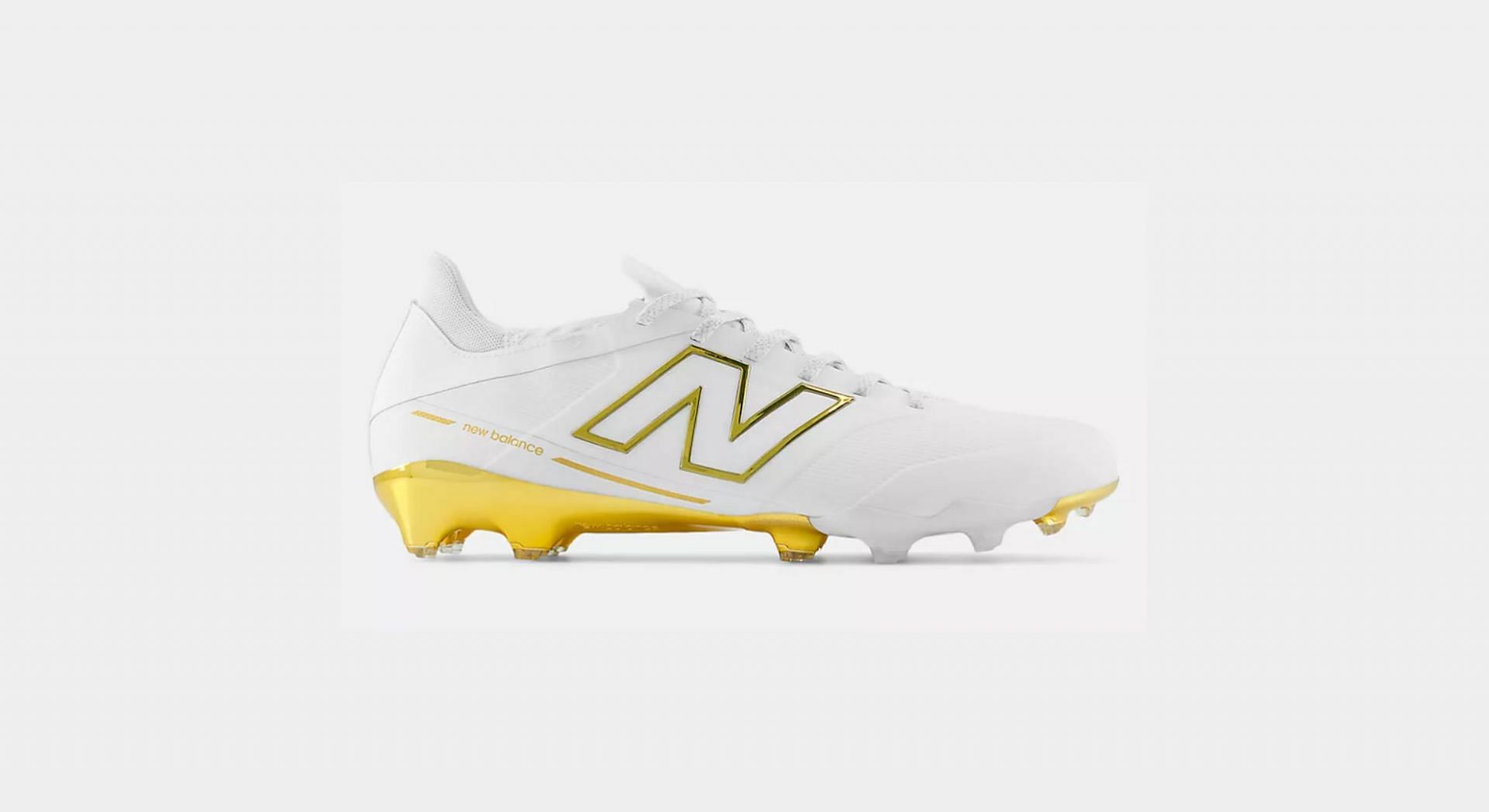 New Balance describes the Prodigy football cleats as built with Fantomfit technology that offers an ultralight feel to the feet, with a hybrid design for ankle support. A white mesh fabric is constructed on the upper, serving as a base for the gold details visible on the side and sole to stand out.