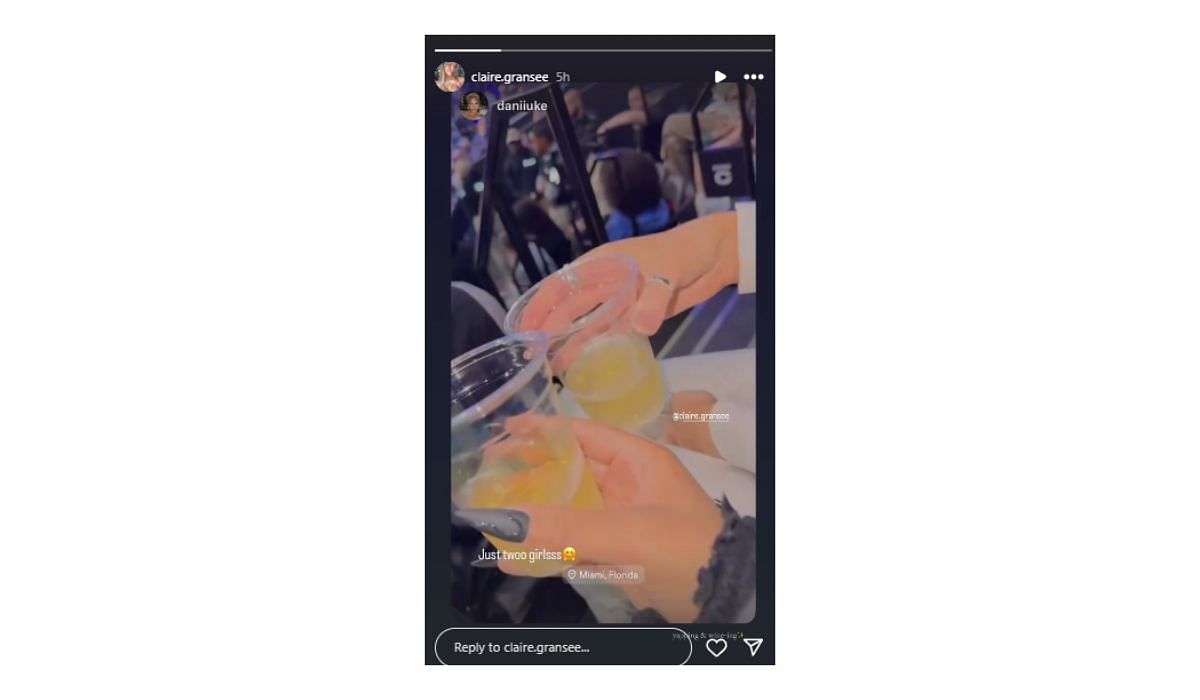 Reposting a story first shared by make-up artist Dani Uke, Claire was seen sipping some white wine from a plastic cup as Uke captioned the story with three words: