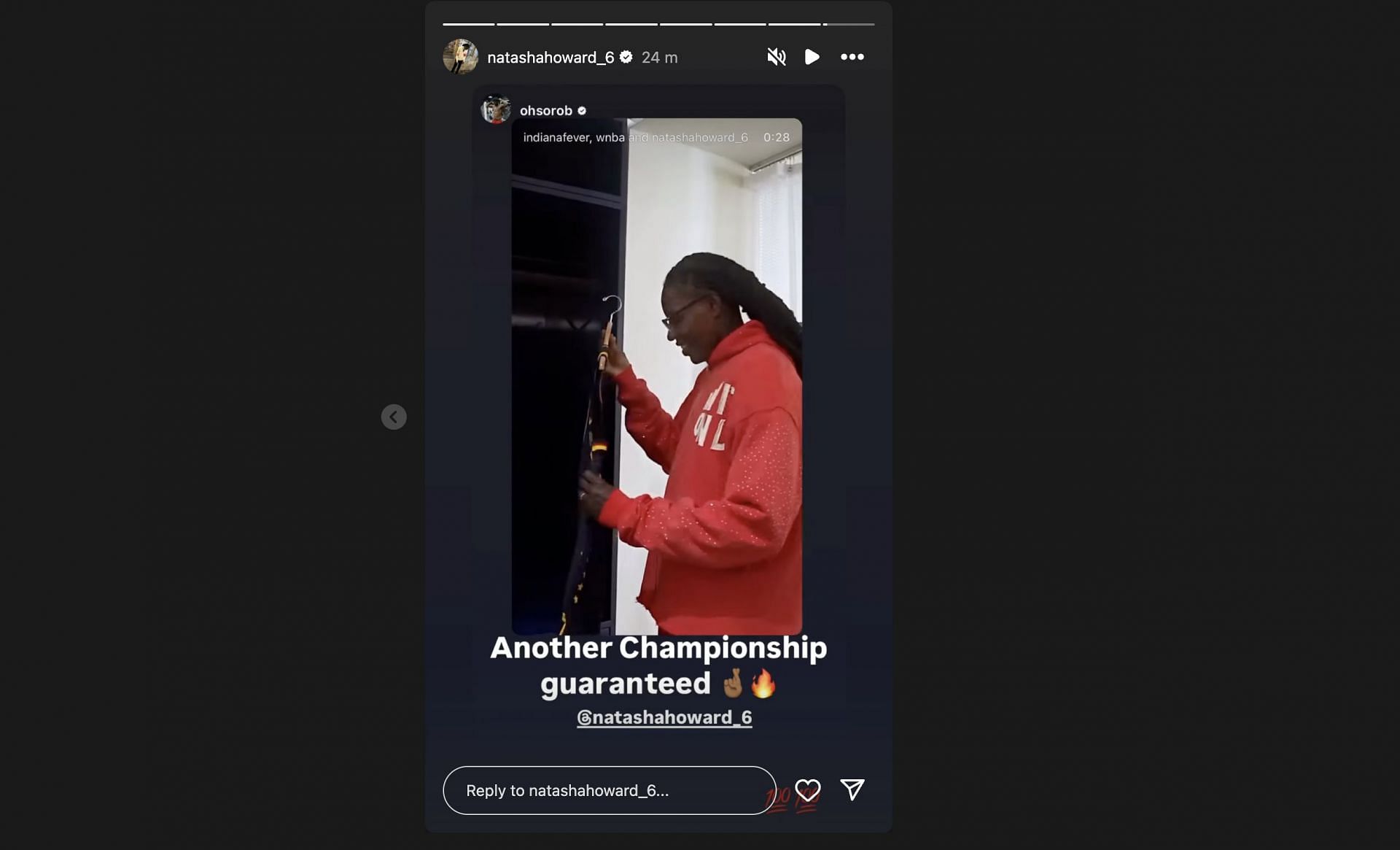 On Saturday, Howard reposted a story from one of her followers, Robert M Sawyers, who said she had "another championship guaranteed" with a video of Howard checking out her new Fever jersey. Howard replied to the story with two "100" emojis.