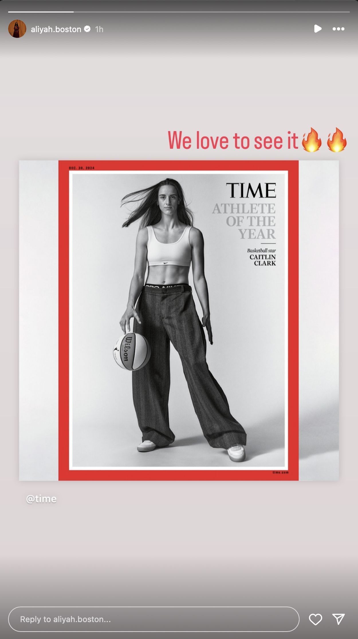 Fans and Clark's peers have been congratulating and praising her for the achievement. In a post on her Instagram story, her Fever teammate, Aliyah Boston, reposted the TIME Magazine with a five-word caption.