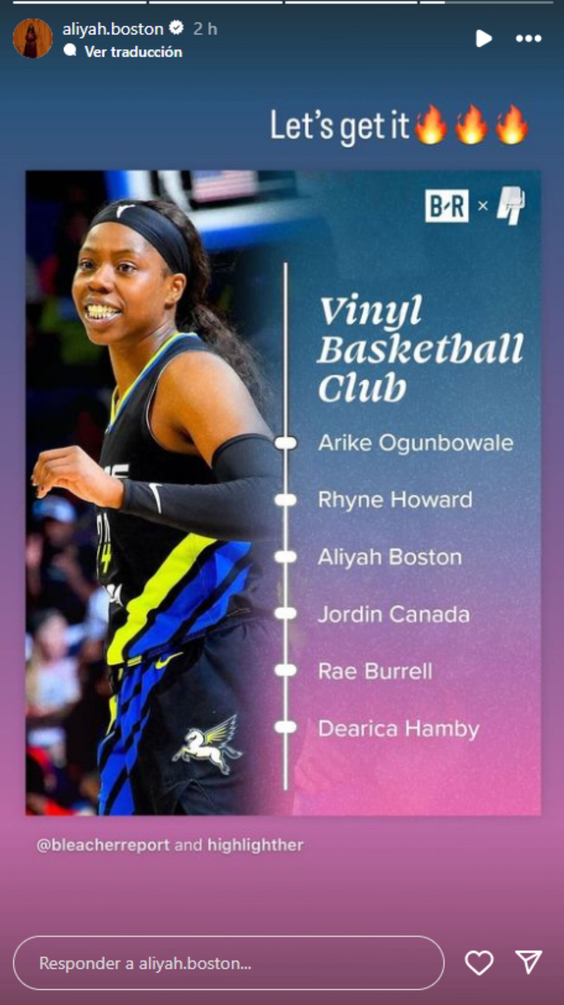 Boston was selected as one of the six members of Team Vinyl, which includes Arike Ogunbowale, Rhyne Howard, Jordin Canada, Rae Burrell and Dearica Hamby. The 2023 WNBA Rookie of the Year reacted to her selection with a three-word message on her Instagram story.
