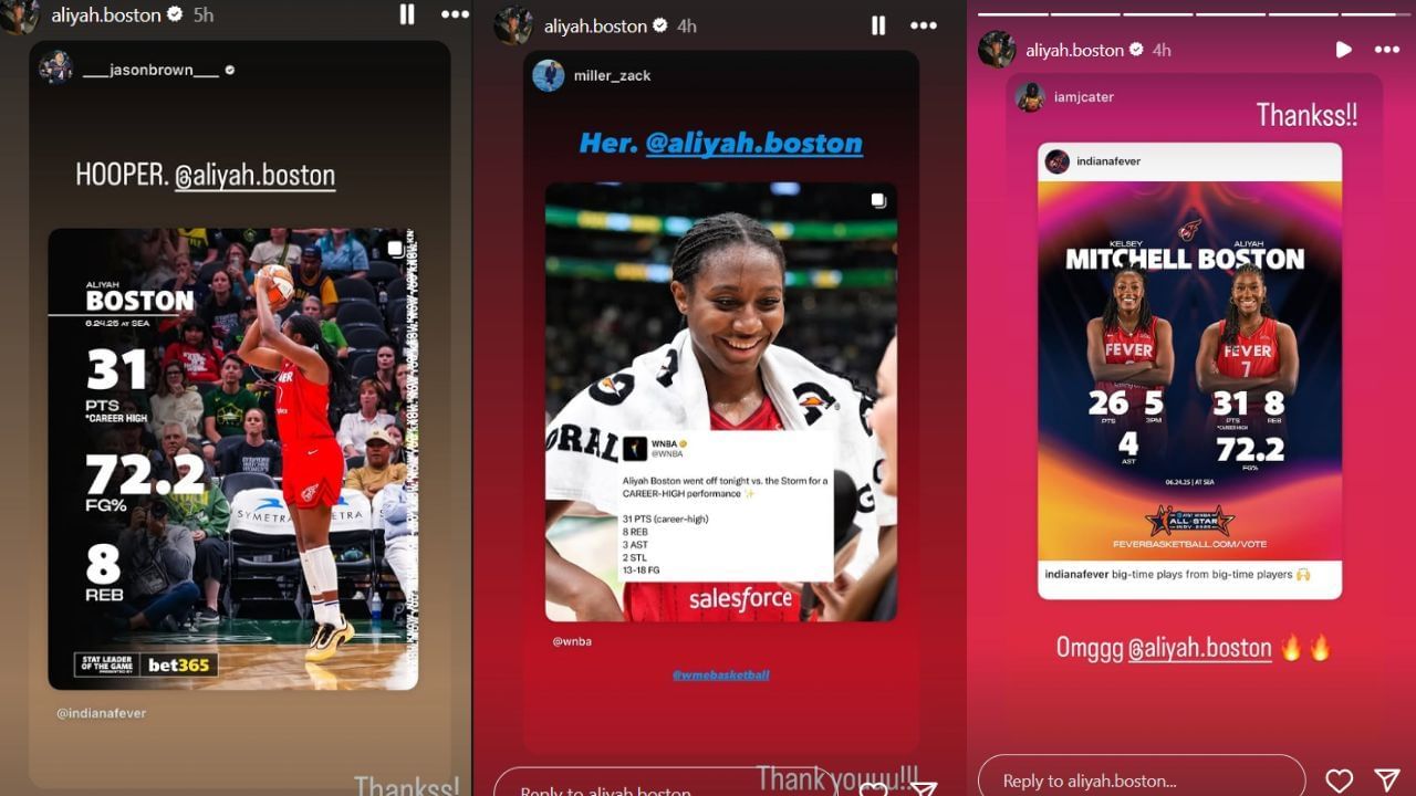 Boston reshared the stories that applauded her for her 31-point explosion and expressed her gratitude.