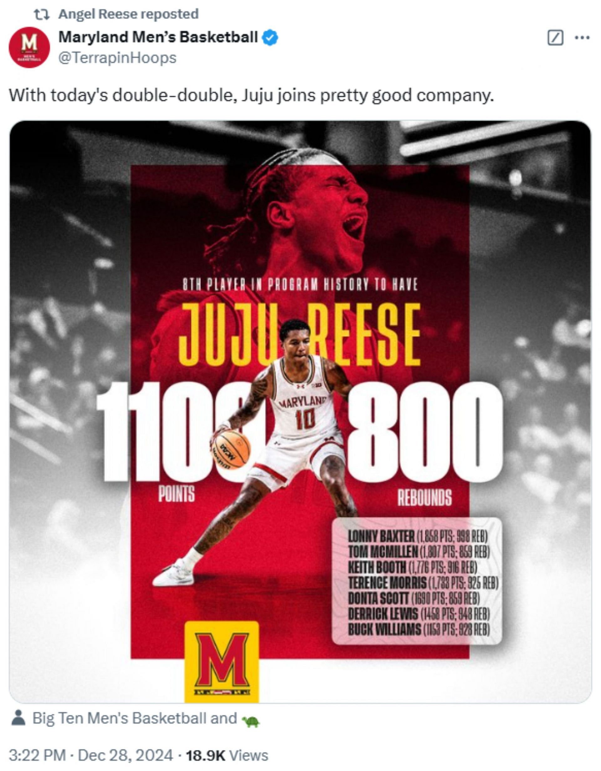 Angel Reese highlighted her brother Julian "JuJu" Reese's latest achievement with the Maryland Terrapins. The team's official X account shared a post celebrating Julian Reese's latest double-double and the outcome of his impressive night.