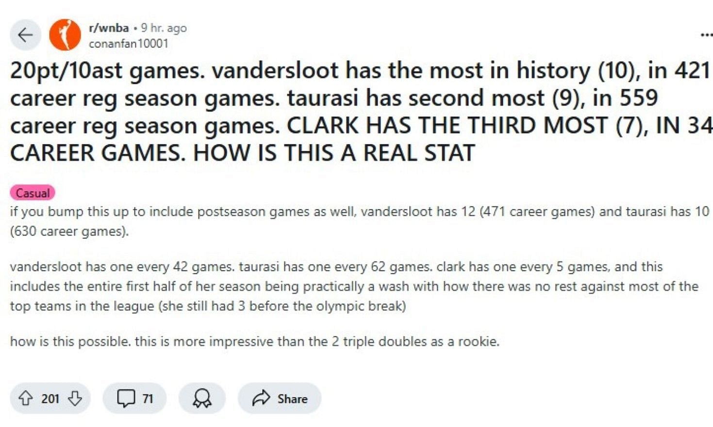 The thread highlighted how Taurasi compiled nine 20-10 games in 559 regular season games, and 10 including the playoffs (630 career games), good for second all time, while Clark is already a close third with seven in just 34 games in her rookie season.