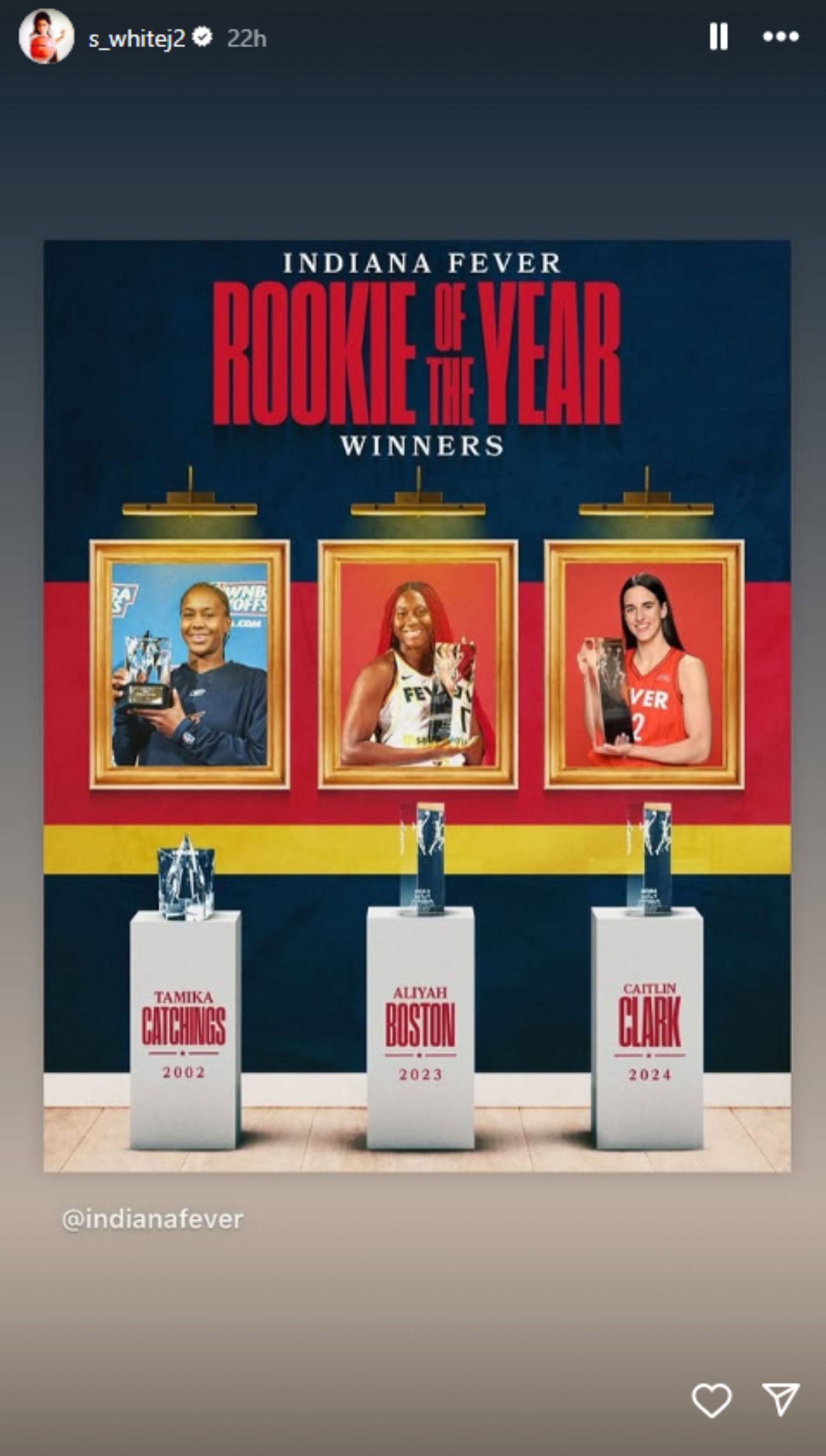 She celebrated Boston and Clark after they joined a legend of the game as Rookie of the Year award winners. She shared Indiana Fever's Instagram post of Tamika Catchings next to Aliyah Boston and Caitlin Clark.