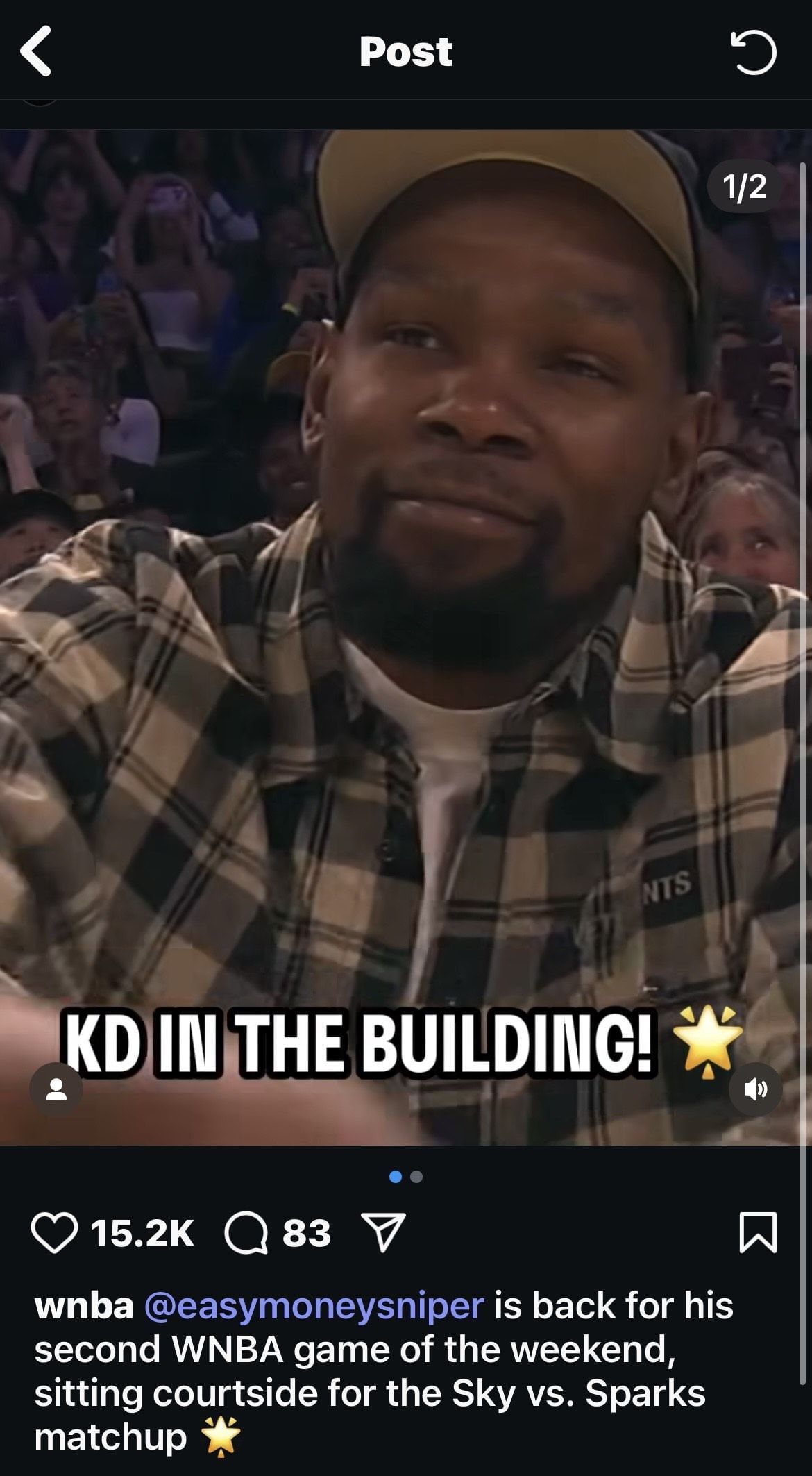 The WNBA shared an Instagram post of the NBA All-Star on Sunday during the Sparks' game against the Chicago Sky.