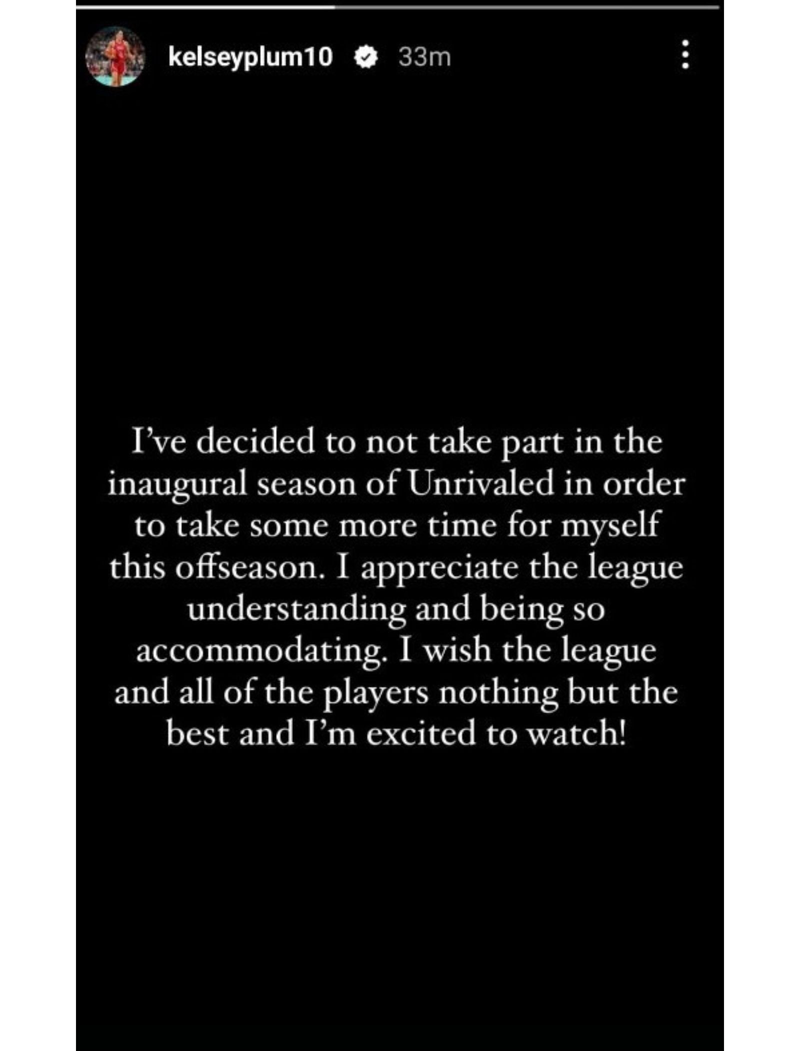 "I've decided to not take part in the inaugural season of Unrivaled in order to take some more time for myself this offseason. I appreciate the league understanding and being so accommodating. I wish the league and all the players nothing but the best and I'm excited to watch."
