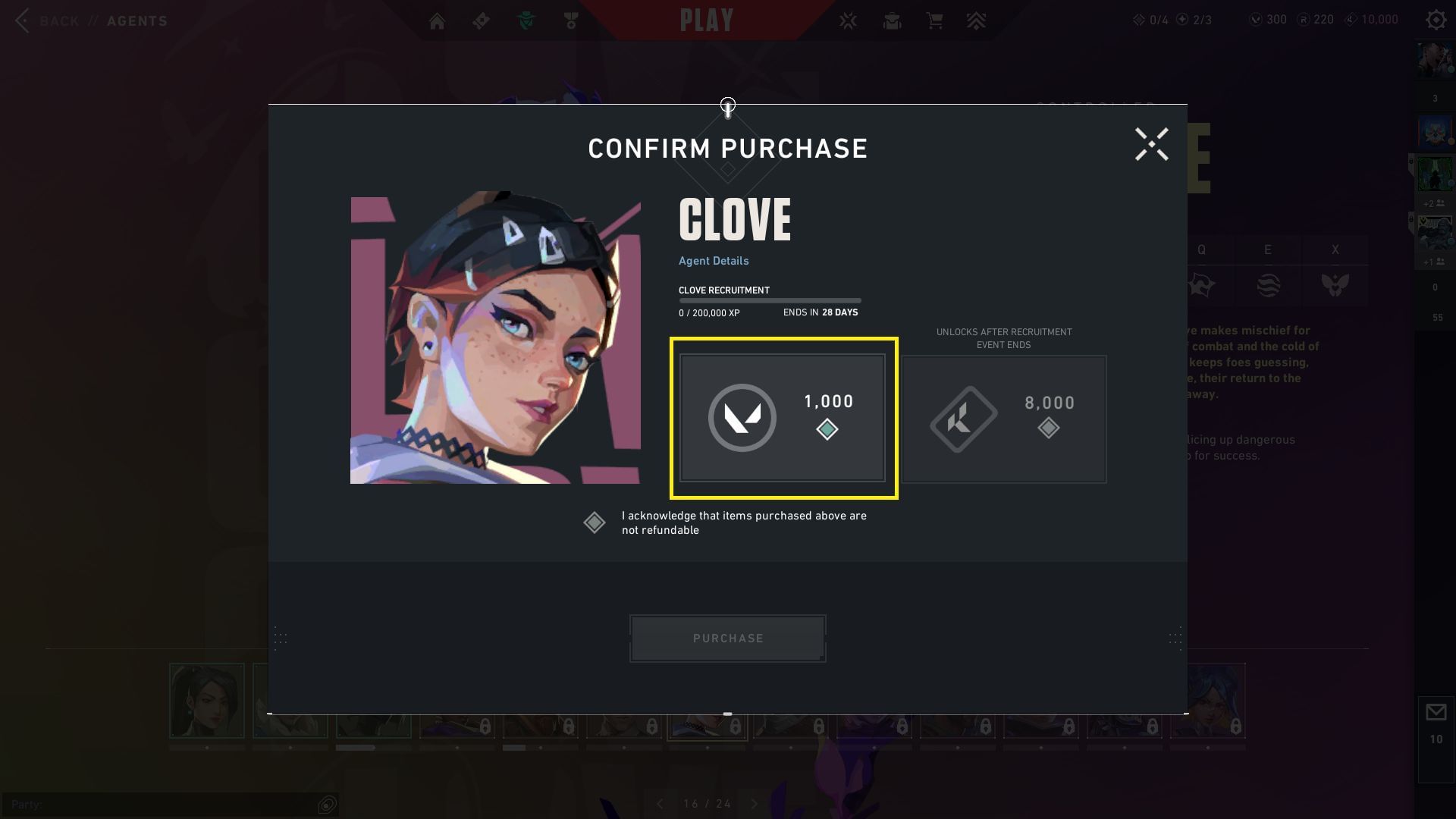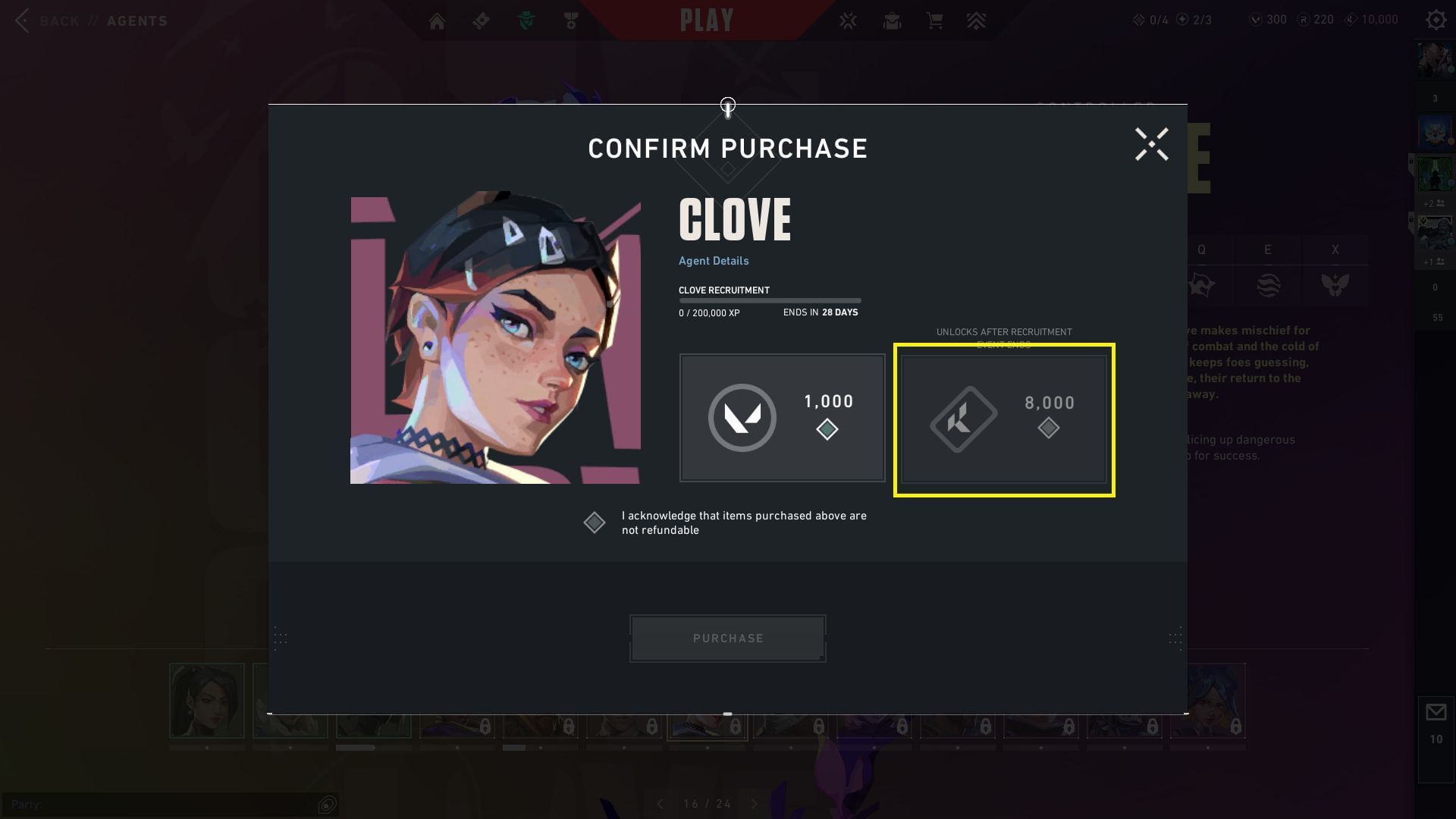 Some players aren’t comfortable with spending VPs that might put a dent in their wallets or don’t want to grind through the recruitment event period. Hence, they can follow another simple but lengthy process. They have to spend 8000 KC (Kingdom Credits) to unlock Clove in Valorant.