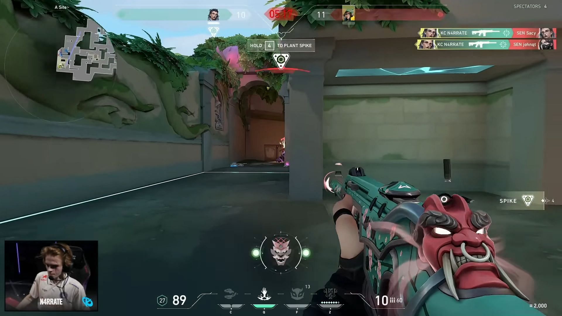 In KC's intense matchup against Sentinels, the team had their backs against the wall. They had lost the first map by 8-13 and were down on the second by 10-11. While the team had unfortunately died early, N4RRATE was the only one left in a 1v3 clutch. With only nine seconds to spare, he tapped the spike to bait out two players and killed them both in an insane spray transfer.