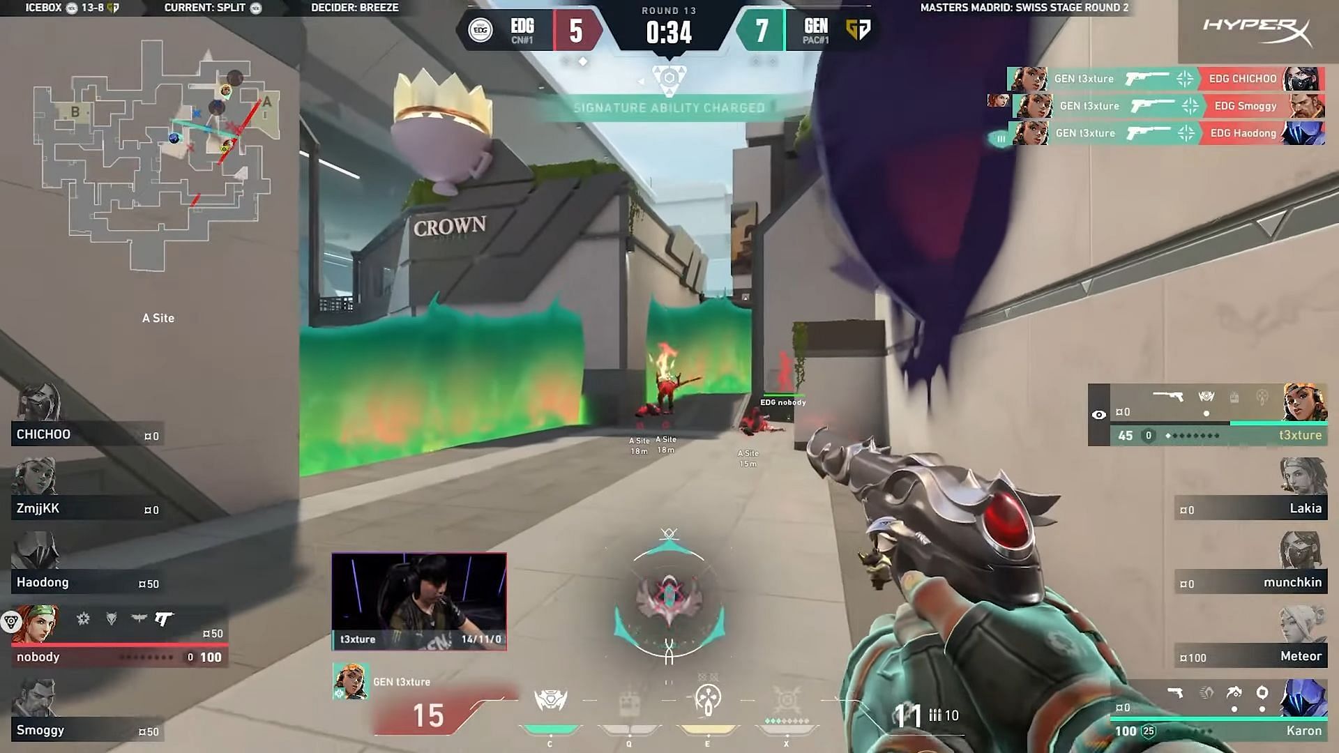 Squad member t3xture had a monstrous performance at the Pacific Kickoff and maintained that form for VCT Masters Madrid. In their match against EDward Gaming on Split, he created one of the most incredible moments of the event. As the EDG players began to swarm into his site, t3xture shut down three of them with just four bullets of his Ghost.