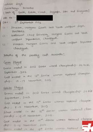 "They have not received the cash awards for many national and international medals during the years 2012 to 2015. We had earlier submitted their application forms to your office and even approached your head office in Panchkula many times. But till date, the girls have not got any cash rewards."