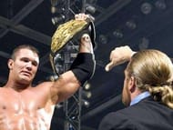 Batista put Orton on his shoulders, and Triple H (playing the role perfectly) flashed him the thumbs up at Orton and then slowly turned them upside down, and then proceeded to order an attack on Orton. Triple H was disgusted that one of his men would take his title.