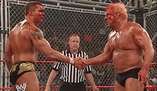 After some classic Ric Flair bumps and cage escape attempts, Flair went for a chair shot to the head of Orton, but Orton ducked that and nailed the RKO for the pinfall. Despite Flair being heel and with Evolution and Orton being the groups opposing babyface threat, the two still shook hands and hugged after the match.