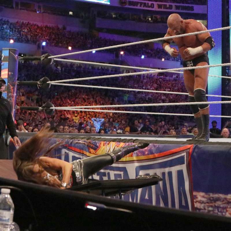 The end of the match saw Triple H nearly hit his wife Stephanie McMahon who was interfering on the apron. He turned around into a Superkick from Rollins that sent Triple H straight into Stephanie who crashed through a table that was set up on the outside.