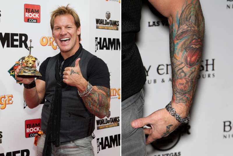 Chris Jericho is also a lover of tattoos. He has five tattoos and three of them are in his left hand. The first is the name of his wife, Jessica, which is tattooed on his ring finger and the second is the letter F as a representation of his band Fozzy, on the back of his hand. The third tattoo is an album artwork of Fozzy's fifth album, Sin and Bones.