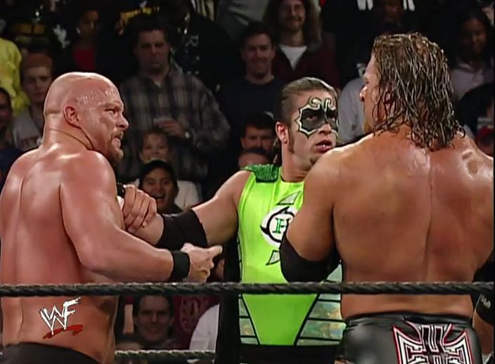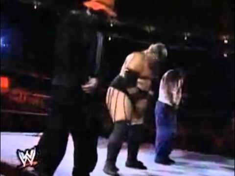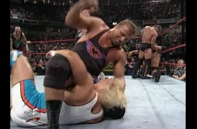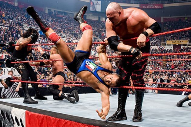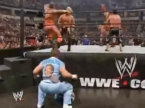 In his first Rumble, he famously attempted to fell both Stone Cold Steve Austin and Triple H in one swift motion...and it didn't work. The two men threw him out with no trouble. So he tried again in 2004, only to once again get overzealous and try to fight a much bigger, much stronger opponent in Matt Morgan.
