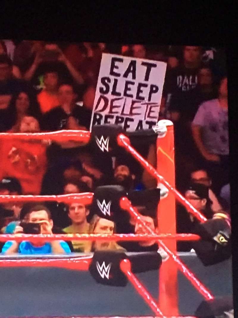 “Wenger Out” signs at random rallys and places is the latest phenomenon. They’ve shown up at anti-Trump rallies, Coldplay concerts and WrestleMania and previous episodes of RAW. Today we got another Wenger Out sign at RAW and this time in the first row. This Arsenal fan was vehement in his sign waving and kept at it throughout the show.