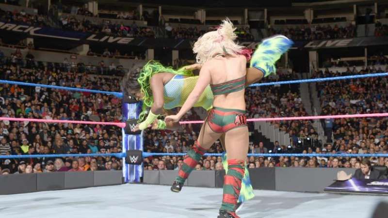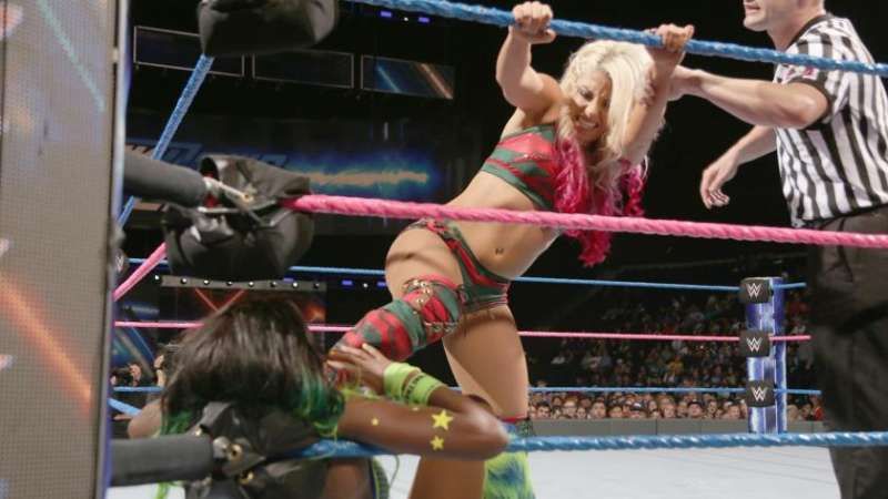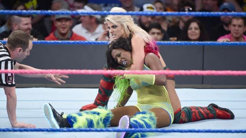 It appears that the two ended up getting back to the ring, with Alexa Bliss having the upper hand as she shoved Naomi on the bottom turnbuckle and tried to choke her out with her boot. You can also see the referee interfering, trying to stop her.