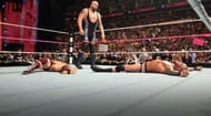 As the battle royal for the intercontinental championship was under way bodies lay about inside and out of the ring. As The Miz and Sheamus were tussling, The Miz was sent flying out of the ring, but not over the top rope, and thus staying a legal competitor.