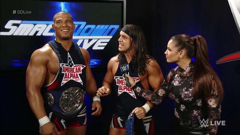 Let’s move on to the only champions who did not get pinned on this week's show. American Alpha told Dasha Fuentes that they've been holding onto the Tag Team titles for a month now, and nobody’s stepped up to the plate to challenge them.