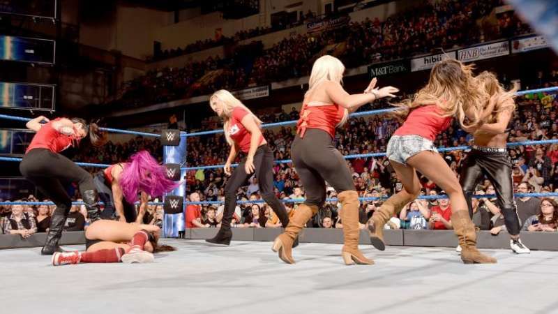 Led by AJ Styles, the men of Smackdown had invaded Raw the night before in Buffalo, New York. This time it was the Raw women who interfered during the Nikki Bella vs Carmella match! The result was explosive, and Nikki Bella chipped a tooth in the process.