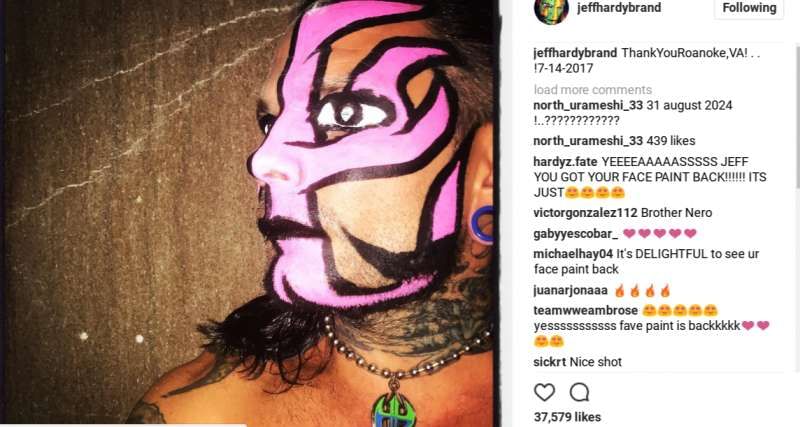 Jeff Hardy recently started changing up his face paint designs, and during a recent live event in Roanoke, Virginia, Jeff debuted this new purple and black design for the fans in attendance.