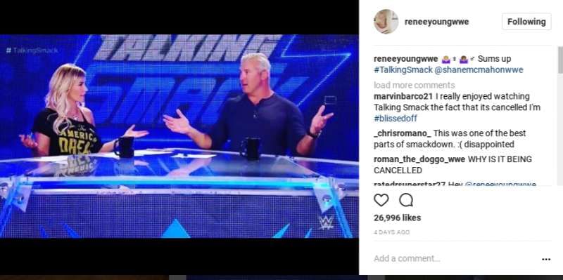If pictures could speak, this one would probably tell a very frustrating story. Fans recently learned the news that Vince McMahon is pulling the plug on the Network exclusive program Talking Smack. Ironically, the host of the show, Renee Young, claims she had to find out via Twitter, and she was not too happy about that either. Renee read a tweet posted by John Canton, which basically talked about how disappointed he was that the show was being cancelled. Renee replied to the tweet by posting “that's one way to get news.”