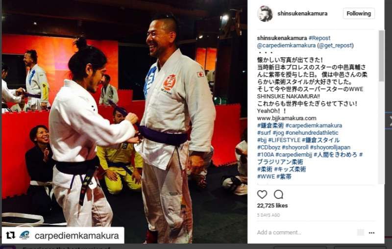 For those who are not aware, Shinsuke Nakamura is a skilled mixed martial artist and was actually practising various forms of MMA prior to his wrestling debut. In this photo, you see Nakamura during a recent belt ceremony at the facility where he practices Brazilian Jiu Jitsu, which is Carpe Diem BJJ.
