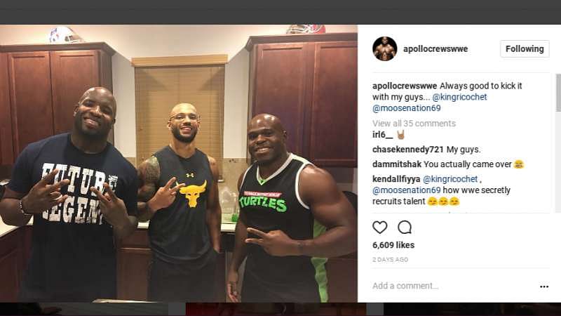 Apollo Crews has maintained a close relationship with several of his former peers from his days as an independent wrestler. Shown here is TNA star Moose and Indie star Ricochet, who also went by Prince Puma during his stint with Lucha Underground.