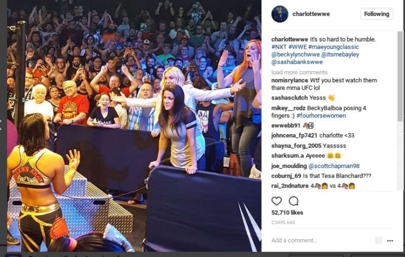 As shown in the Instagram post, Shayna’s partners were out in full force at Full Sail University, supporting her as she competes in the Mae Young Classic. Thankfully, there was an aisle and plenty of security separating The Four Horsewomen and the ladies of WWE.