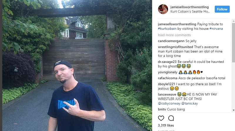 James Ellsworth may play a yellow-bellied heel on screen, but he seems like a cool dude in real life. Here we see him in front of Nirvana frontman, Kurt Cobain’s palatial house. Let’s hope he did not enter the place and ruin history inside the legendary mansion. Rock on, James Ellsworth!