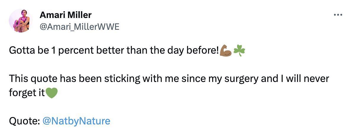 Ahead of her positive update and the road to recovery, Amari Miller shared a video performing a barbell bicep curl. She also credited Natalya for motivating her with a quote stating to be a percent better than the day before.