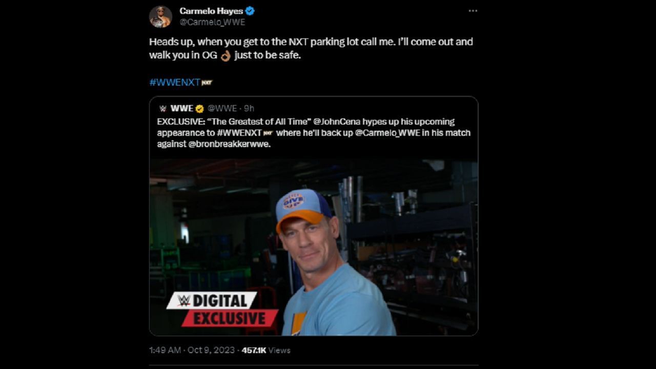 John Cena hyped up the upcoming bout in an exclusive video shared on Twitter by WWE. Carmelo Hayes responded to Cena, and offered to save him from a potential attack in the NXT parking lot. Check out the response below: