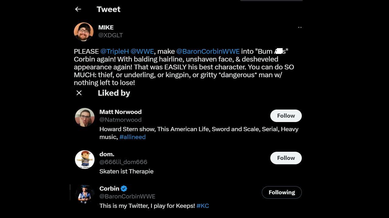 Corbin noticed the tweet and 'liked' it, hinting that he would love to go back to being 'Bum A**' Corbin on WWE TV. Check out the screenshot of Corbin's 'like' below: