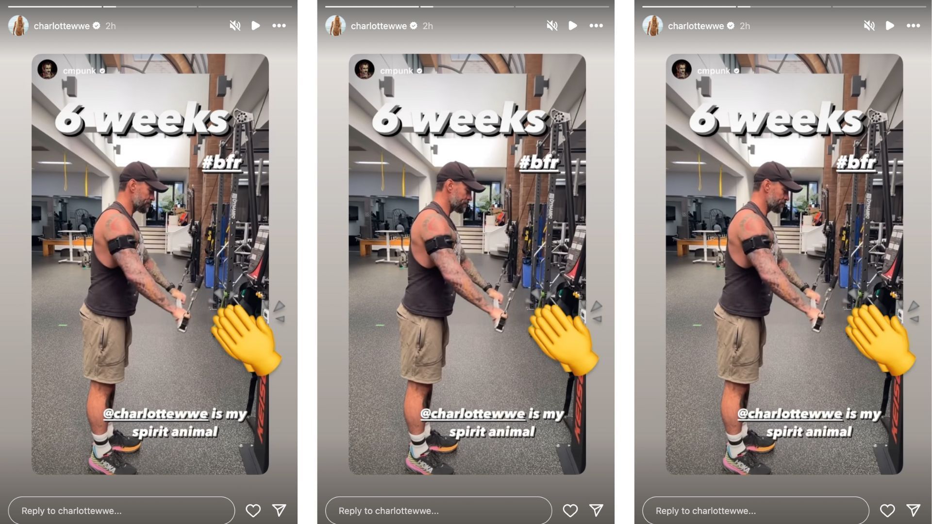 Punk took to social media today to share a video of himself working out six weeks following his surgery. He noted that Charlotte Flair was his spirit animal in the post on his Instagram story. Charlotte Flair reacted to the Straight Edge Superstar's message on her Instagram story and added a clapping emoji, as seen in the image below.