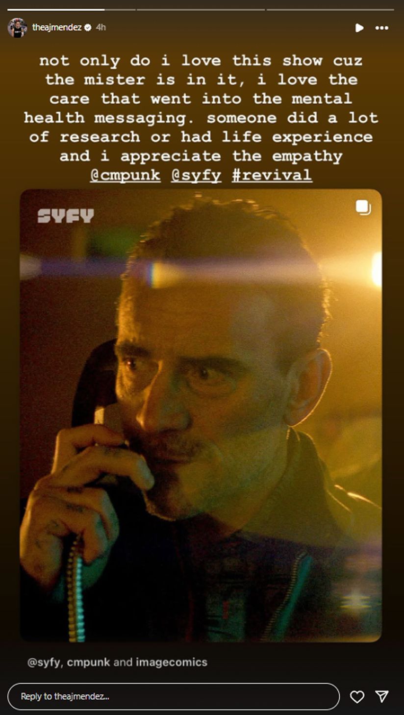 "not only do i love this show cuz the mister is in it, i love the care that went into the mental health messaging. someone did a lot of research or had life experience and i appreciate the empathy @cmpunk @syfy #revival," she wrote.