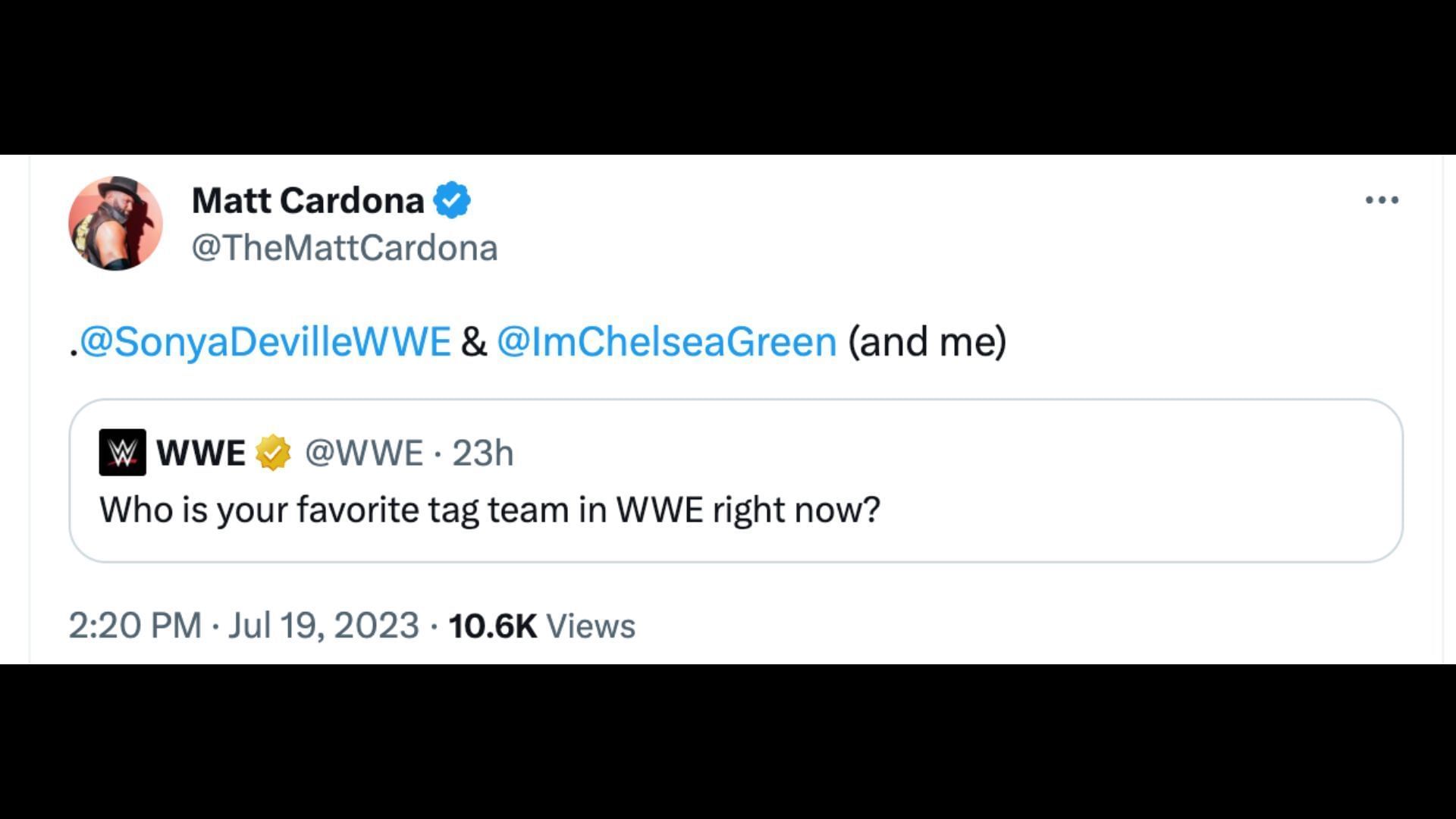 Former superstar Matt Cardona is married to Chelsea Green and made a hilarious claim today on social media. WWE's official Twitter account asked fans who they believe is the most popular tag team in the company. Cardona responded that Green and Deville were the most popular due but then added himself in parenthesis. You can check out his tweet by clicking here.