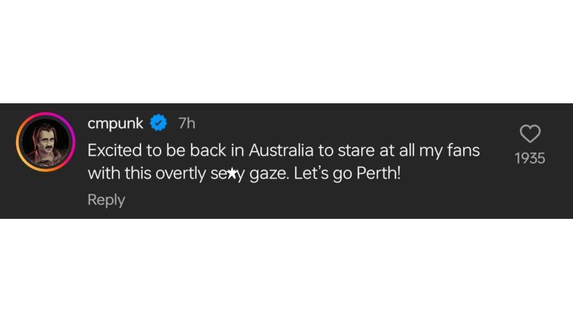 "Excited to be back in Australia to stare at all my fans with this overtly s*xy glaze. Let's go Perth!" Punk wrote.