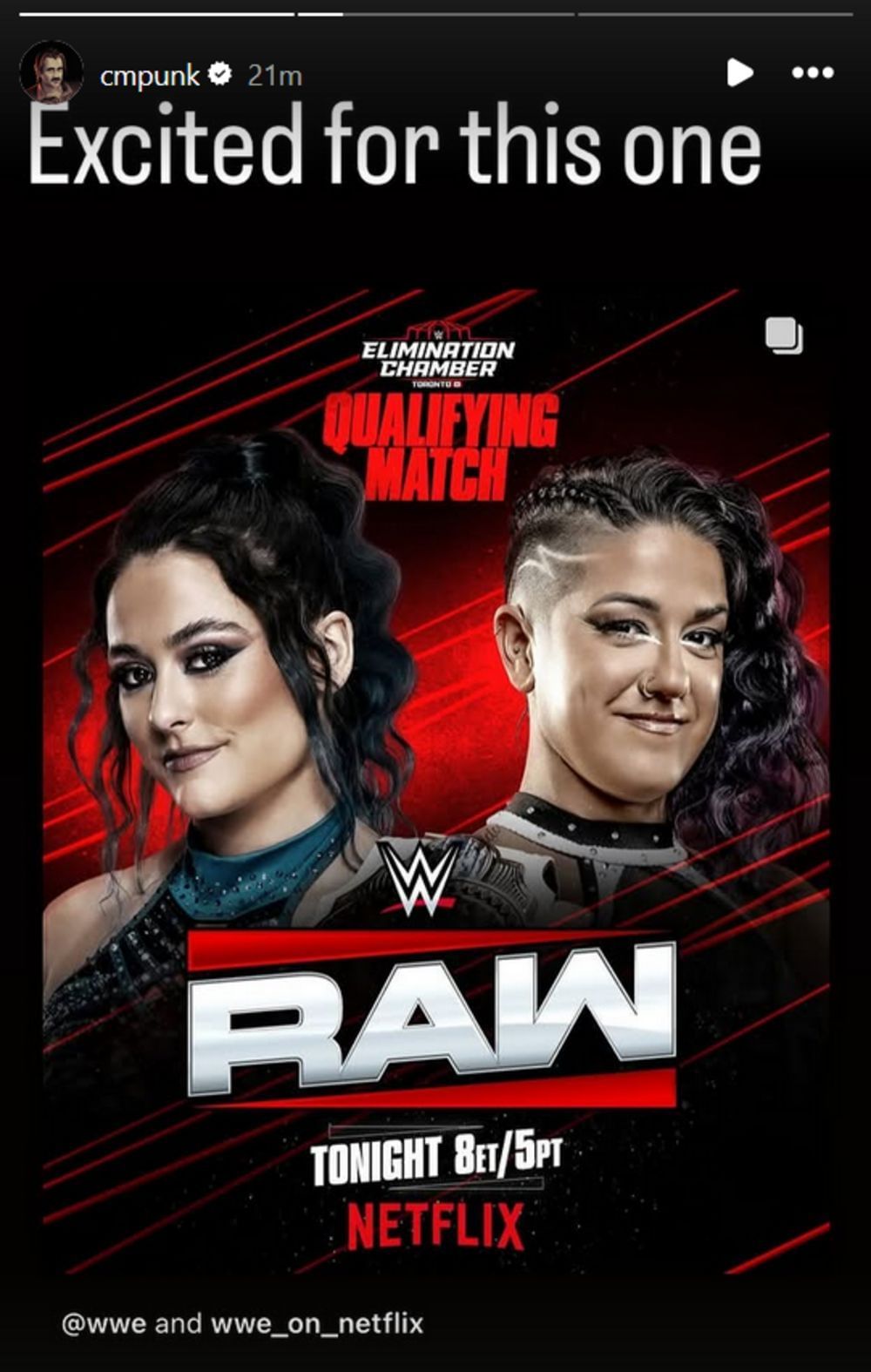 Punk took to his Instagram Stories ahead of tonight's show and first gave a big plug to Bayley vs. Valkyria. This is the only pre-RAW endorsement that the former AEW World Champion handed out today.