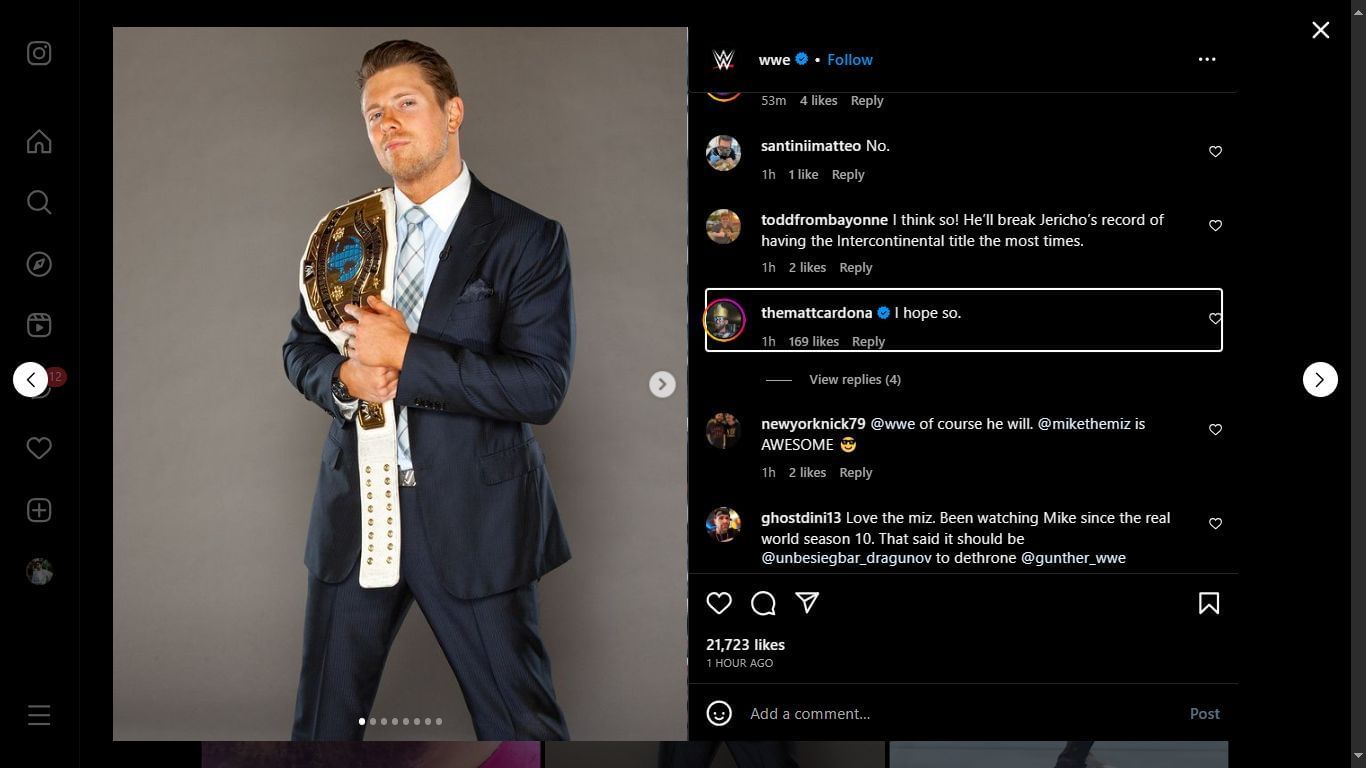 Matt Cardona (f.k.a. Zack Ryder) took to his Instagram account and backed The Miz to win the prestigious title one more time. A former Intercontinental Champion himself, Cardona commented on a post on WWE's official Instagram account which asked if The Miz would be able to become a nine-time Intercontinental Champion.