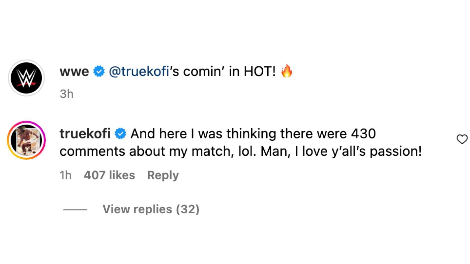 Kofi Kingston reacted to the backlash today on social media. He shared a comment on WWE's Instagram and joked that he thought the 400 fan responses were for him. The New Day member lauded fans for their passion.