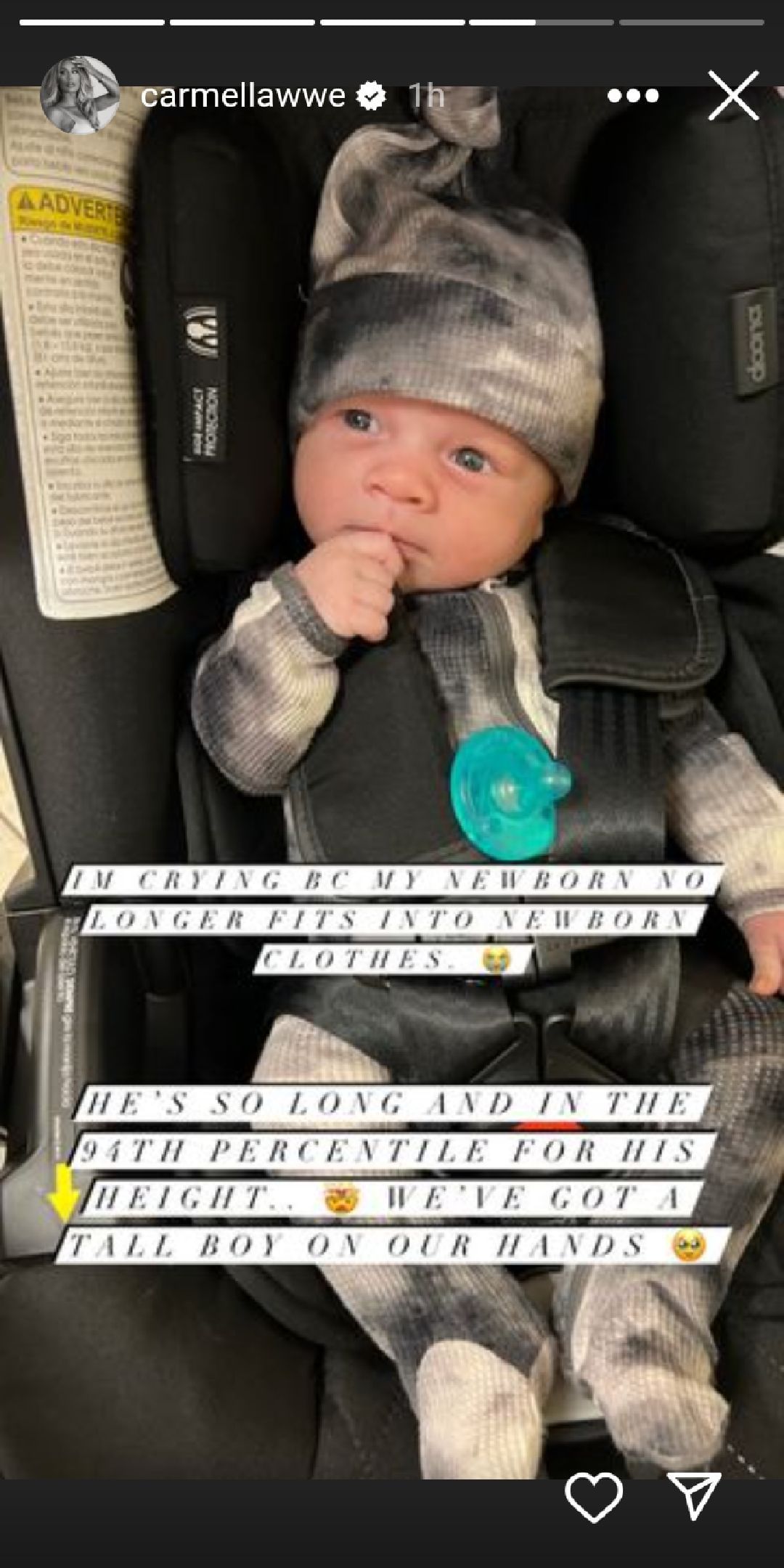 Carmella recently took to her Instagram account to share a personal update with her followers. She also posted a picture of her newly born on her Instagram story. The former Champion believes the offspring will be tall when he grows up, as his clothes no longer fit him.