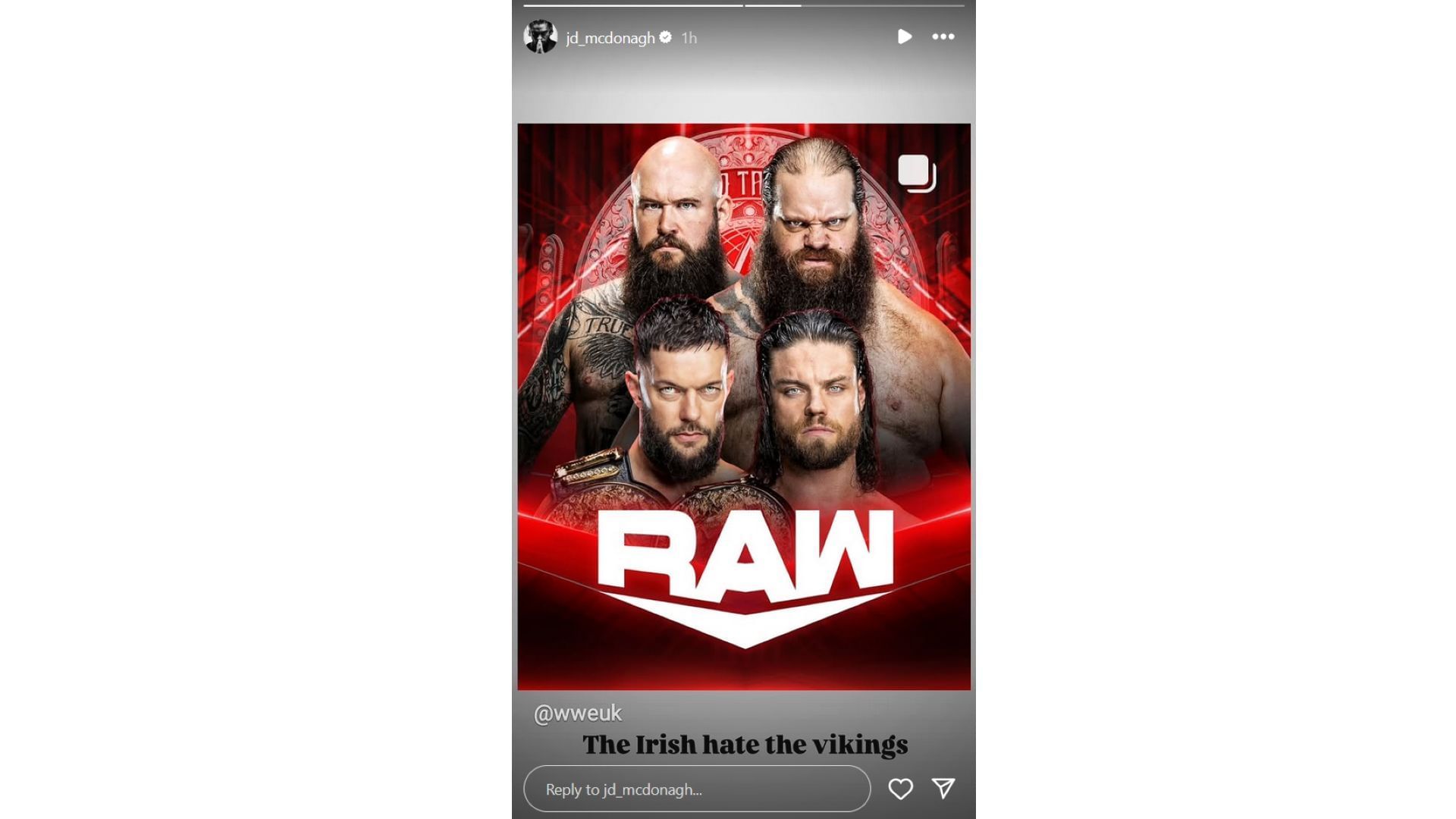 JD took to Instagram today to take a shot at the tag team formerly known as The Viking Raiders. There are several examples throughout history of Norse Vikings battling various Irish armies but also forming alliances with different groups from Ireland. McDonagh seemingly referenced this history when hyping up tonight's RAW title defense with a five-word caption on the match graphic.