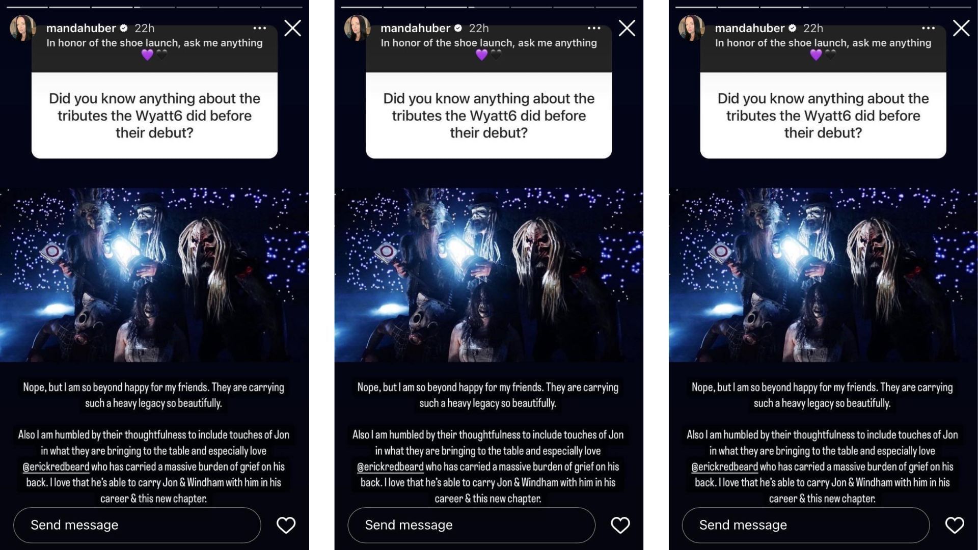 Brodie Lee's wife, Amanda Huber, took to her Instagram story to share her thoughts on the Wyatt Sicks faction. She was asked if she was aware of any of the tributes from the faction beforehand and she said she was not. Huber said she was happy for her friends especially Erick Rowan, who recently signed a new deal with WWE.