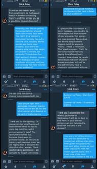After the snapshots of the conversation surface, Mick Foley issued a statement saying that he would not be indulging in conversations with fans by direct messaging. Foley also said that he would discontinue tweets for the remainder of the week. The statement said: