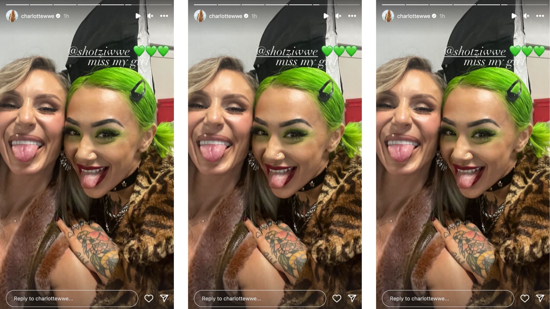 Last month, Charlotte Flair tore her MCL, ACL, and meniscus in a match against Damage CTRL's Asuka. Despite the injury, The Queen has been in good spirits and shared a photo with Shotzi while backstage last night at the Royal Rumble. Flair added that she missed the SmackDown star, as seen in the image below.