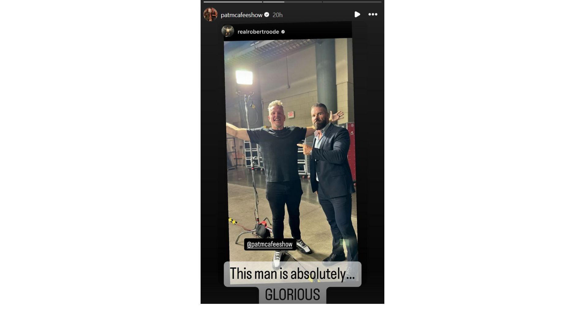 The Glorious One has produced matches for RAW and premium live events for almost a year now, with the occasional gig at SmackDown. Roode took to his Instagram stories this week and shared a backstage photo of Pat McAfee. The red brand commentator re-posted the image to his feed today, and captioned it with praise for The It-Factor of Professional Wrestling.
